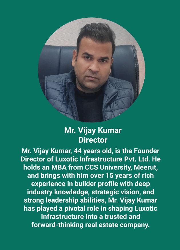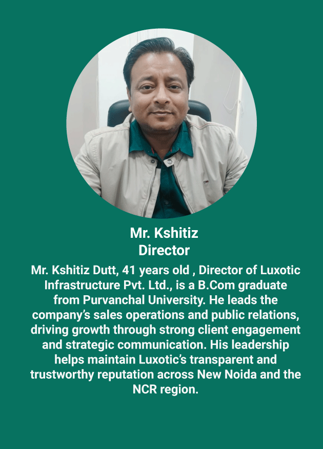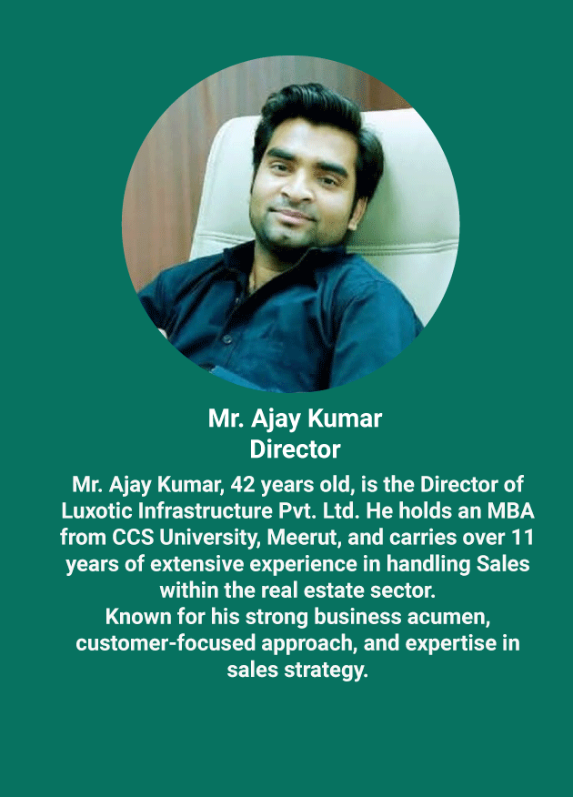 At Luxotic Infrastructure Pvt. Ltd., our leadership is driven by experience, vision, and a strong commitment to building value-driven real estate developments. Our directors bring deep industry knowledge, strategic thinking, and a passion for creating modern communities that inspire growth.