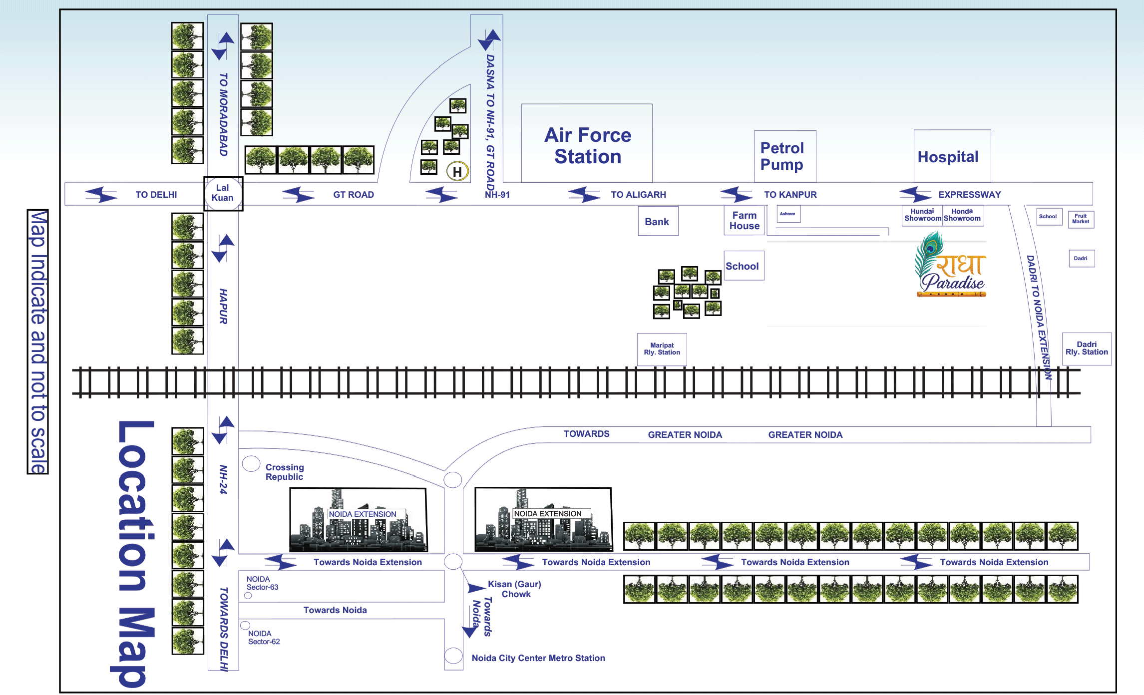 Radha Paradise enjoys one of the strongest and most strategic locations in New Noida, offering seamless connectivity to major cities and highways. Situated along NH-91 (GT Road), the project benefits from a rapidly developing corridor that links multiple high-growth regions across NCR.