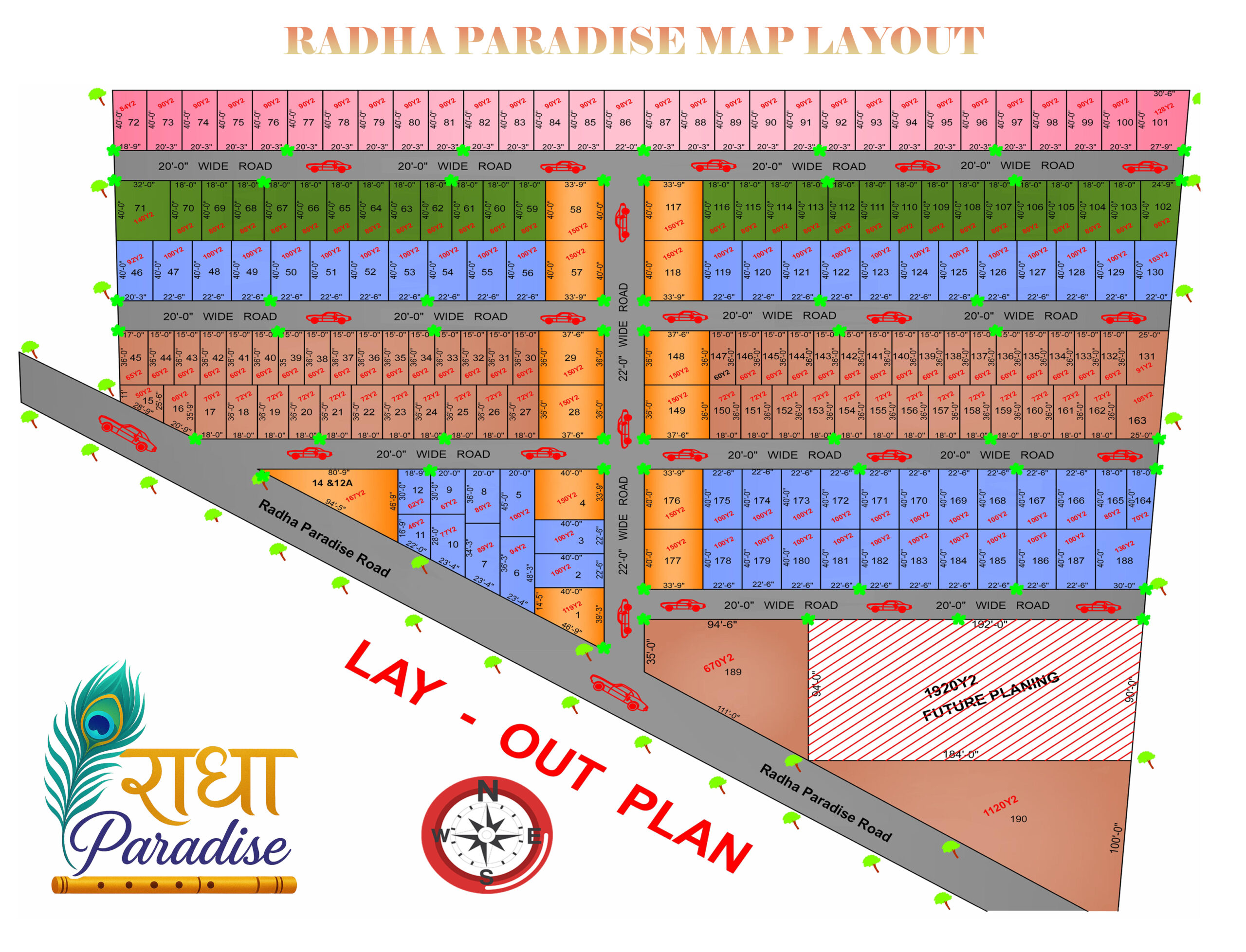 Map layout of Radha Paradise is thoughtfully designed to ensure smooth accessibility, balanced open spaces, and premium plot alignment. Wide internal roads connect every block seamlessly, while the grand entry gate opens into a well-planned network of residential plots arranged for maximum convenience and ventilation. Green belts, plantation zones, and common utility areas are strategically placed across the layout to create a refreshing and eco-friendly environment.